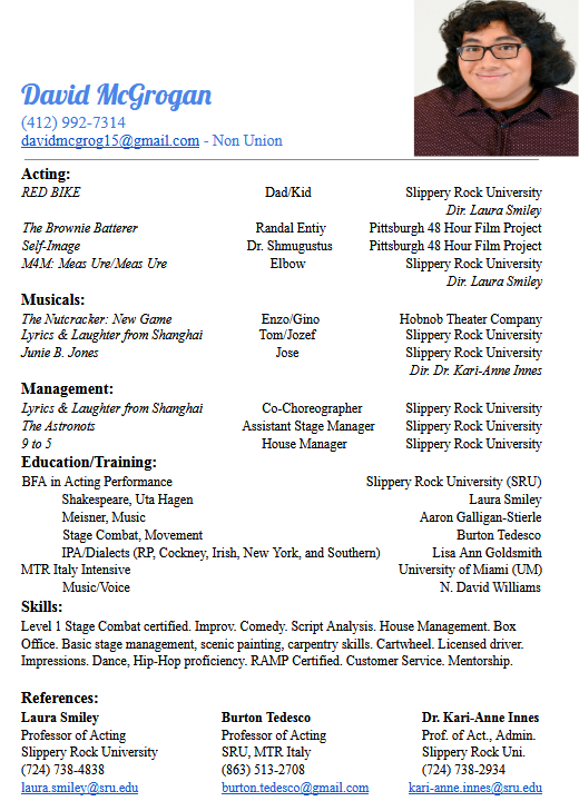David McGrogan (He/They) is a sweet, amiable friend who always sees the joys around every corner. He’s a multi-hyphenate heart-warmer proud to be based in Pittsburgh with an unwavering passion for short and long-form Improv, Shakespeare, and politically wake-up-slapping work for inspiring change. In his free time he is drenched in the world of Pokemon trading cards and competitive battling while balancing the perfect amount of cream and Splenda in his iced coffee. He is a loyal friend that always uplifts and jests, eager to spread more joy in the world. :)